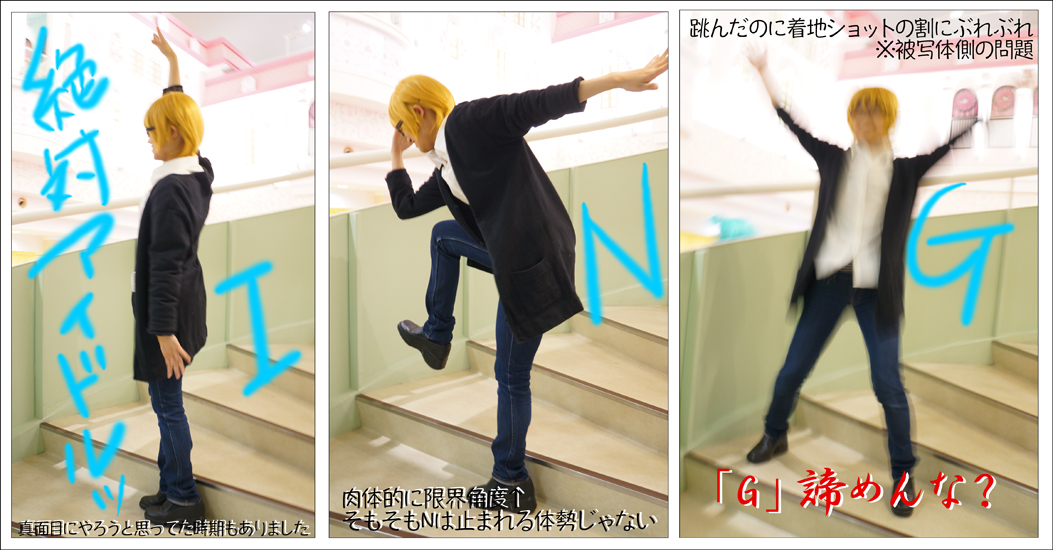 この階段みたいなとこで撮ってる時に、涼宮ハルヒが通過したので真似したよ。